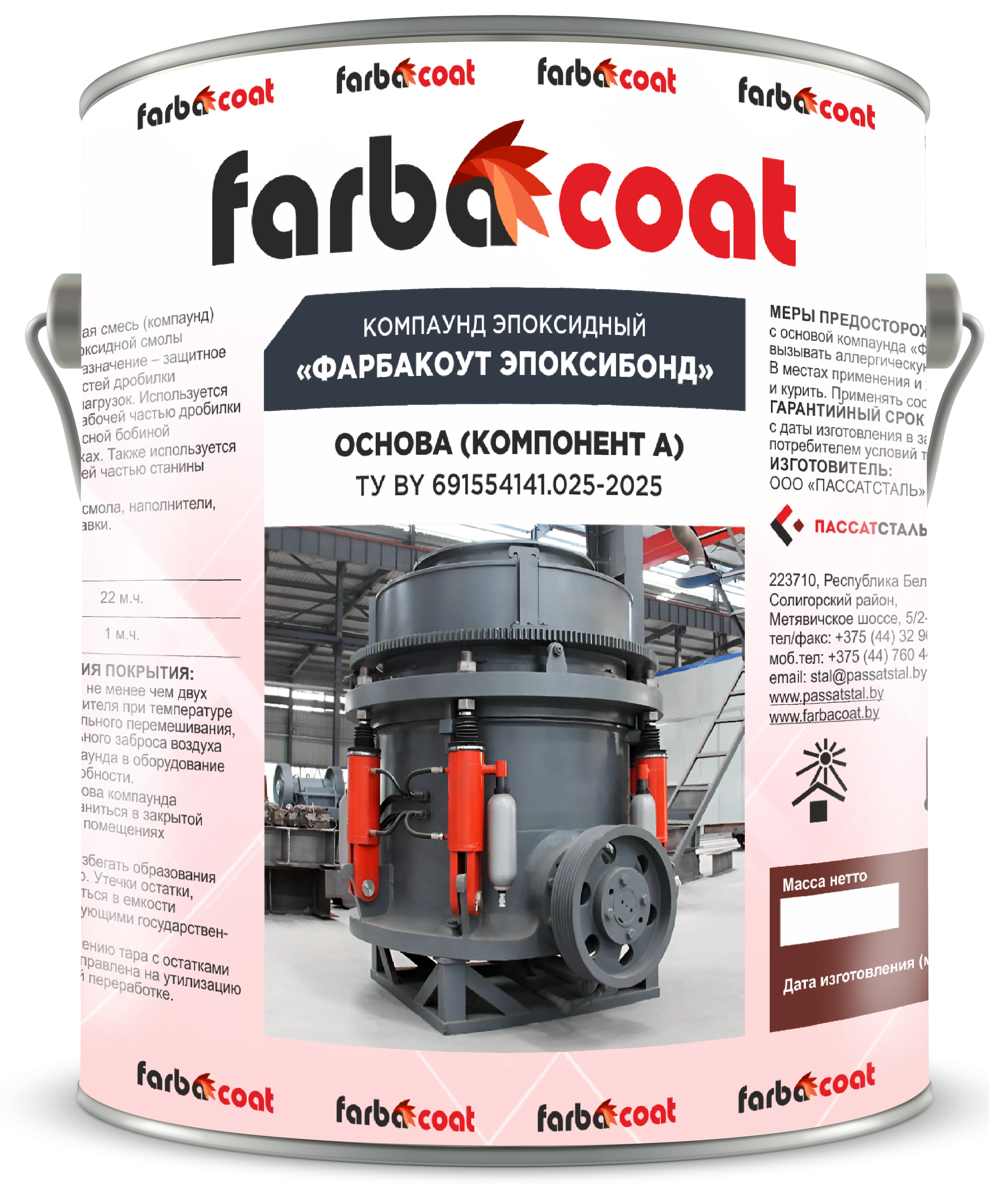 Фарбакоут ЭПОКСИБОНД — двухкомпонентная защитная смесь (компаунд) и амортизирующий материал на основе эпоксидной смолы для конусных дробилок. Функциональное назначение – защитное и армирующее покрытие рабочих поверхностей дробилки и демпфирование (амортизация) ударных нагрузок. Используется для заполнения полостей между верхней рабочей частью дробилки и внешним корпусом и между рабочей конусной бобиной и внутренним корпусом в конусных дробилках. Также используется для заполнения пространства между верхней частью станины и размывателями.