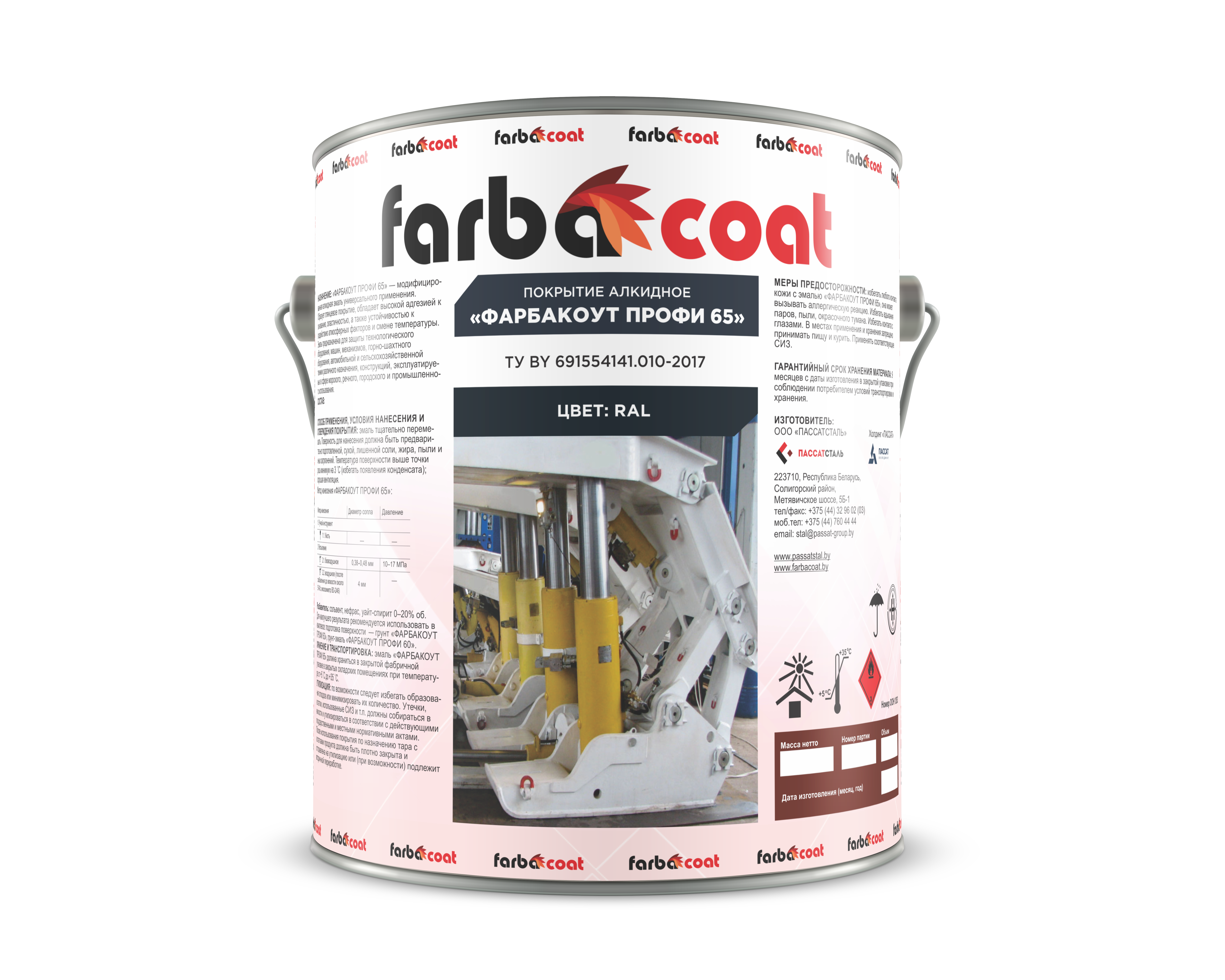 «ФАРБАКОУТ ПРОФИ 65» модифицированная алкидная эмаль универсального применения. Образует глянцевое покрытие, обладает высокой адгезией к основанию, эластичностью, а также устойчивостью к воздействию атмосферных факторов и смене температуры. Эмаль предназначена для защиты технологического оборудования, машин, механизмов, горно-шахтного оборудования, автомобильной и сельскохозяйственной техники различного назначения, конструкций эксплуатируемых в сфере морского, речного, городского и промышленного использования.
